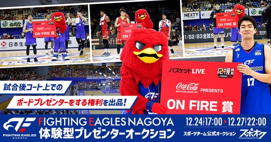 株式会社モバオク(本社:東京都渋谷区、代表取締役社長:生田目 知之、以下モバオク)がエンゲート株式会社(本社:東京都中央区、代表取締役:城戸 幸一郎、以下エンゲート)と業務提携し提供するスポーツチーム公式オークションサービス「スポオク」にて、B.LEAGUE所属のファイティングイーグルス名古屋が実施する「FE名古屋 体験型プレゼンターオークション」を2024年12月24日(火)から開始いたします。
