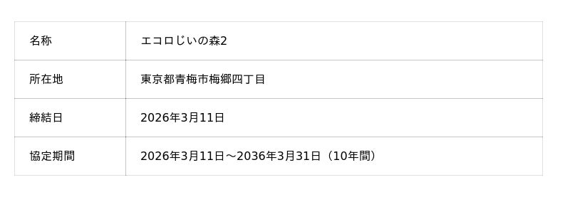 NTTアーバンソリューションズ株式会社(本社:東京都千代田区、代表取締役社長 池田 康)は、2026年3月11日(水)、公益財団法人東京都農林水産振興財団が東京都とともに進める「花粉の少ない森づくり運動」の一環である「企業の森」の主旨に賛同し、協定を締結しました。NTTアーバンソリューションズグループ(以下「当社グループ」)としては、株式会社NTTファシリティーズが2017年より同事業に基づき森林保全活動を行っている「エコロじいの森」(青梅市黒沢)に続く、2件目の「企業の森」となります。