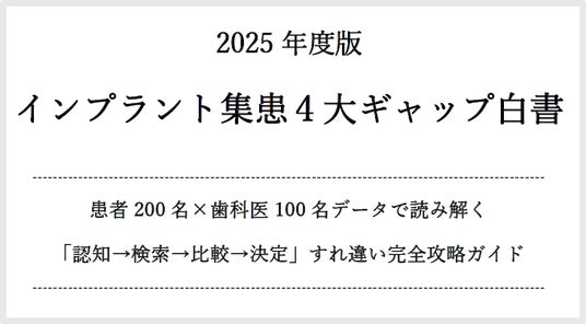『インプラント&ホワイトニング集患4大ギャップ白書』を無料配布しています。患者の選択行動と医院側の認識のズレを整理し、実務に役立つ改善策をまとめたものです。ご希望の方は、以下のよりお問い合わせください。