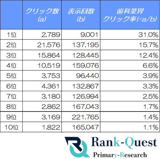 【SEO対策】で検索結果No.1を獲得した(注1)ランクエスト(https://rank-quest.jp/column/column/how-to-seo/ )は、2025年4月において歯科業界のクライアントサイトで上位10位以内にランクインした8,386件の歯科関連キーワードを対象に検索順位ごとのクリック率(CTR)を徹底的に分析しました。
