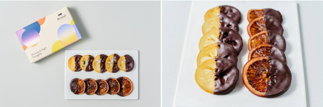 ドライレモンにフルーティなチョコレートを合わせた「モーニング」と、1日の終わりのリラックスする時間におすすめの、ブラッドオレンジにフルボディのチョコレートを合わせた「ナイト」の2種が入っています。