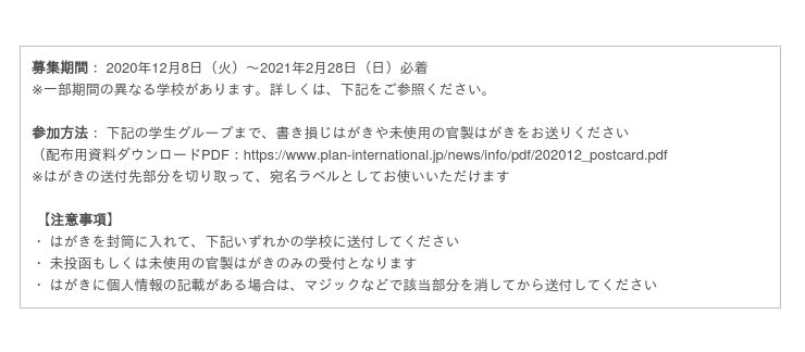 国際NGOプラン・インターナショナル(所在地:東京都世田谷区 理事長:池上清子 以下、プラン)は、2020年12月8日~2021年2月28日の期間「書き損じはがき・未使用はがきキャンペーン2021」を開催します。