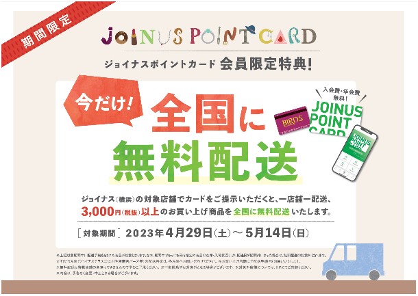 ジョイナスの対象店舗で、ジョイナスポイントカードまたは相鉄ショッピングセンターアプリの会員証をご提示いただくと、1店舗1配送につき、3,000円(税抜き)以上のお買い上げ商品を、全国に無料配送いたします。