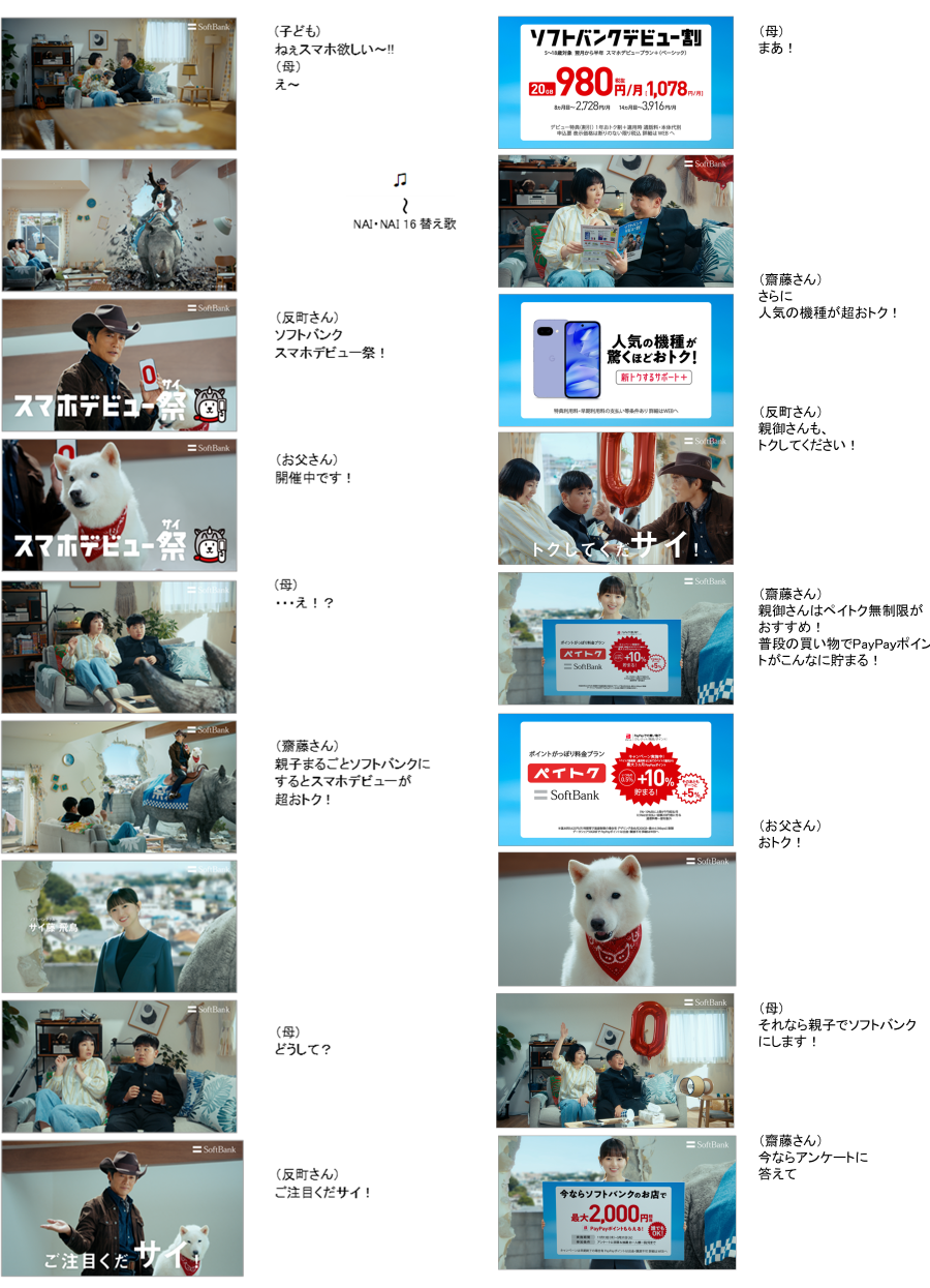 ソフトバンクショップの店頭では、クルー役の齋藤飛鳥さんが“サイ藤飛鳥”として登場。シブがき隊の名曲「NAI・NAI 16」を「スマホデビュー祭」仕様にアレンジした替え歌を歌いながら、反町さんと共に“サイ”尽くしの演出で「ソフトバンクデビュー割」の魅力を伝えます。ラストは齋藤さんが「来てくだサイ!」と締めくくります。