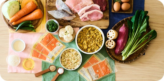 2024年10月、既存の冷凍タイプの栄養素とおいしさ、安全性といった手づくりごはんの魅力はそのままに、常温で2年保存できるウェットフードも発売。手作りご飯がより手軽で便利になりました。