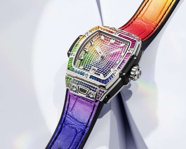 493個の宝石が虹のように輝き、58個のバゲットカットストーンがベゼルの周りにセットされています。繊細な色合いは、ステンレススチールモデルでは控えめなエレガンスを醸し出し、キングゴールドモデルではその豊かさが際立っています。