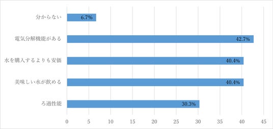 一方、整水器のメリットは、「電気分解機能がある」(42.7%)が最も多く、次いで「美味しい水が飲める」(40.4%)、「水を購入するよりも安価」(40.4%)が挙げられており、整水器の独自の機能(電気分解)に対する回答が上位となりました。(図10)