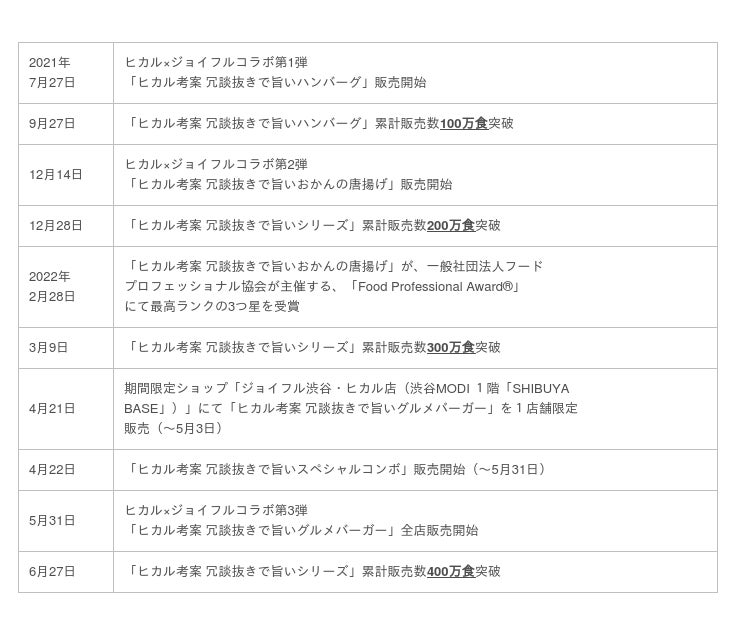 2022年6月27日現在では、「ヒカル考案 冗談抜きで旨いハンバーグ」、「ヒカル考案 冗談抜きで旨いおかんの唐揚げ」「ヒカル考案 冗談抜きで旨いグルメバーガー」や各種テイクアウト・オードブルを販売しております。