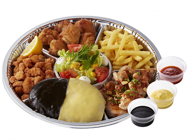 ・ポテトフライ(180g)・イタリアンチェリーモッツァとトマトのサラダ・なんこつ唐揚げ・ひとくちチキンステーキ にんにく醤油・特製お好みソース&ハニーマスタードソース&ケチャップ付