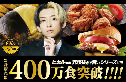 ファミリーレストランのジョイフル(本社:大分県大分市 代表取締役社長:穴見くるみ)は、全国のジョイフル店舗やオンラインショップにて好評販売中の当社アンバサダー・ヒカルさんとのコラボレーション商品「ヒカル考案 冗談抜きで旨いシリーズ」の累計販売数が400万食を突破したことをお知らせします。