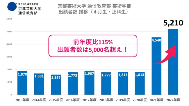 学校法人瓜生山学園 京都芸術大学(京都市左京区/学長 吉川左紀子)通信教育部 芸術学部の2022年度春入学の出願者数が確定し、総出願者が5,210名(前年度 4,540名、115%)となりました。1998年度に日本で初めての4年制の通信制芸術大学を開設以来、過去最多の出願者数です。