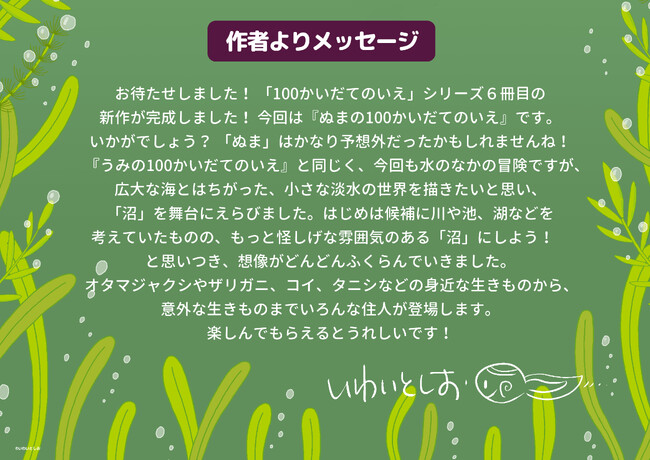 株式会社偕成社(出版社 本社:東京都新宿区 代表取締役社長:今村正樹)は、刊行後わずか10年でミリオンセラーになった『100かいだてのいえ』(いわいとしお 作/2008年初版)からはじまる、人気絵本シリーズの最新刊『ぬまの100かいだてのいえ』を10月4日に刊行しました。