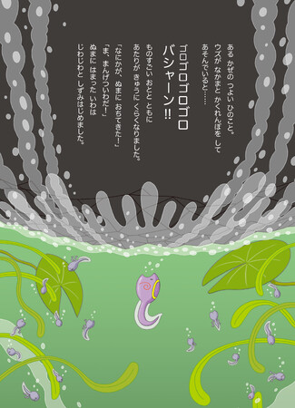 ザリガニ、コイなどの子どもたちにとって身近な生き物から、ウーパールーパー、コオイムシなどのちょっと意外な生きものまで、個性ゆたかな生きものたちが、ウズを迎えます。さて、深い深いぬまの底で待っているのはだれでしょう?