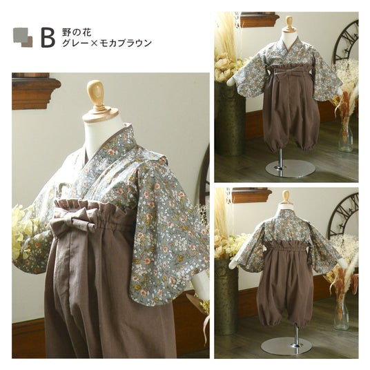 着物はあたたかみのあるグレーの地に淡い橙色、白、薄茶色などの野花の模様。浅い茶色の重ね衿。袴は浅い茶色。