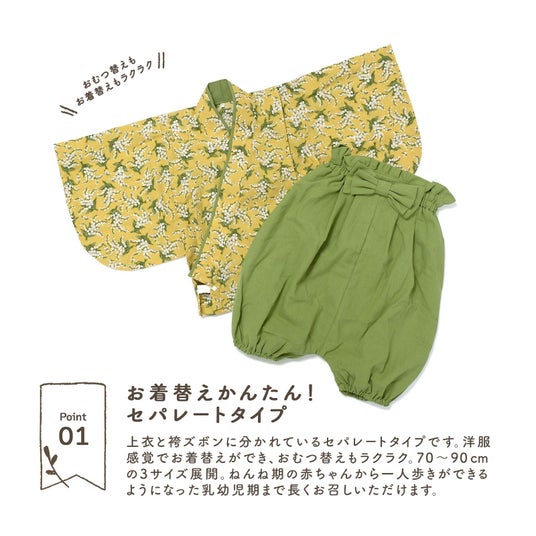 Point01 お着替えかんたん!セパレートタイプ上衣と袴ズボンに分かれているセパレートタイプです。洋服感覚でお着替えができ、おむつ替えもラクラク。
