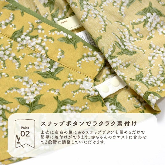 Point02 スナップボタンでラクラク着付け上衣は左右の脇にあるスナップボタンを留めるだけで簡単に着付けができます。赤ちゃんのウエストに合わせて2段階に調整していただけます。