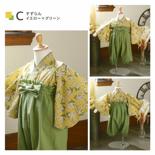 着物はややグレイッシュな落ち着いた黄色の地に白と緑のスズラン模様。浅い黄緑の重ね衿。袴は浅い黄緑。
