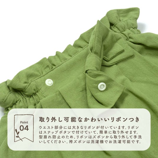 Point04 取り外し可能なかわいいリボンつきウエスト部分には大きなリボンが付いています。リボンはスナップボタンで付けていて、簡単に取り外せます。