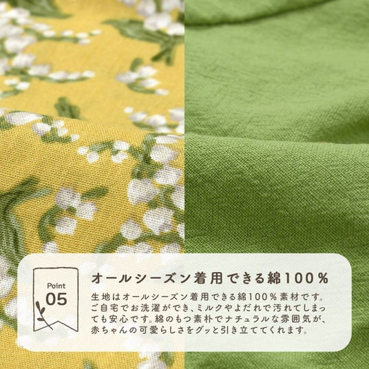 Point05 オールシーズン着用できる綿100%生地はオールシーズン着用できる綿100%素材で、ホルマリン検査済み。ご自宅でお洗濯ができ、ミルクやよだれで汚れてしまっても安心です。