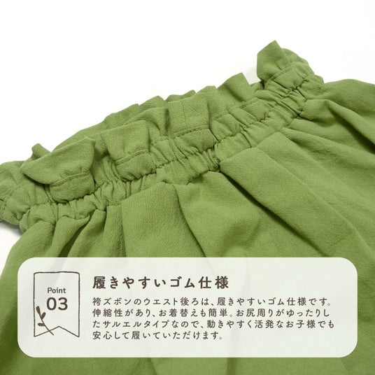 お尻周りがゆったりしたサルエルタイプなので、動きやすく活発なお子様でも安心して履いていただけます。