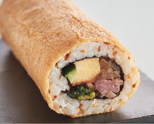 「津軽かもと菜の花のいなり恵方巻き」は、新登場の商品。旨みのある「津軽かも」のローストや菜の花を、甘辛く炊いた揚げで巻いた恵方巻きです。