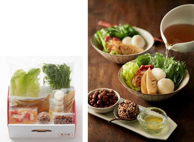 ●セット内容:温野菜パーツ(大根、人参、ねぎ、生麩)/精進だし/ゆり根まんじゅう/たけのこ/ロメインレタス/水菜/薬味(玄米入り味噌玉、柚子オイル)/煎り大豆の山椒味噌キャラメル