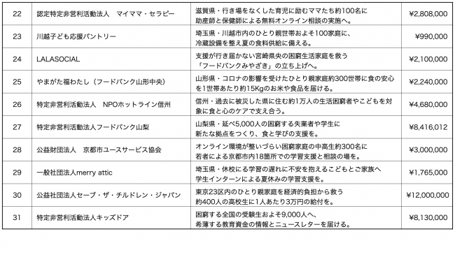 第4期(前期)の助成団体は31団体、助成総額は122,089,412円に決定いたしました。なお、本日発表した助成採択団体へ助成金の振込は7月22日(水)を予定しています。