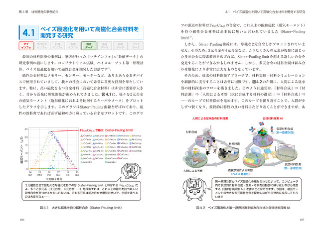 また、マテリアルズ・インフォマティクスに欠かせない機械学習について、その活用のポイントを解説しています。機械学習では使用するデータの良し悪しやその扱い方で、求める結果が得られるかどうかが決まります。本書は、そんな機械学習を効果的に実践するためのエッセンスが分かる一冊です。