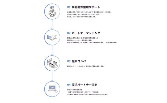単なるマッチング紹介にとどまらず、事業構想や要件定義の整理から、複数のパートナー候補との提案比較、最終決定までをワンストップでサポートします。