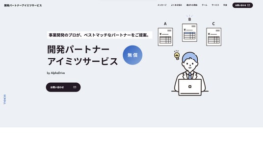 「開発パートナーアイミツサービス」は、アルファドライブが提供する新規事業伴走支援の一環として、開発パートナーの選定から契約までのプロセスを無償で支援するサービスです。