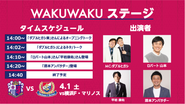 4/1(土)横浜FM戦メインMCは吉本セレッソ応援隊で「ytv漫才新人賞決定戦」で見事優勝したダブルヒガシがコンビで登場となります。当日はMCの他にネタも披露いただきます。
