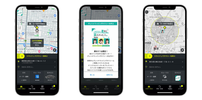2023年12月6日(水)~12月27日(水)の期間中、アプリ内の「いますぐ呼ぶ」から、「ダレハナラッピングタクシー」を指定して配車することが可能です。(予約には対応していません。)