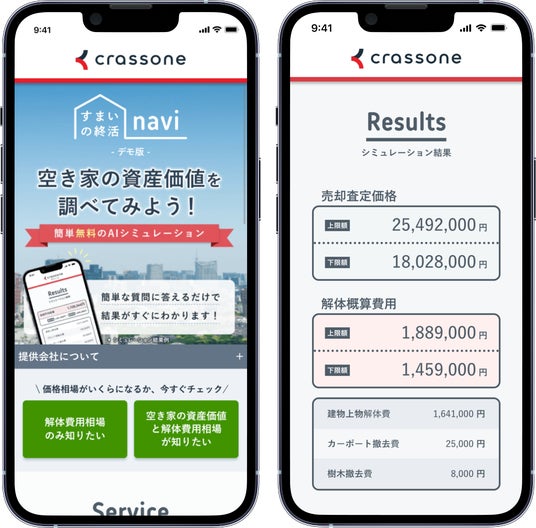 スマートフォン等から土地建物の面積や最寄り駅、接する道の幅などの条件を入力することで、「解体費用」と解体後の「土地売却査定価格」の概算額を手軽に無料で把握することができ、「解体費用がどのくらいか分からない」といった情報不足の解消や、解体後の土地売却の見通しが立たないために空き家の解体に踏み切れない所有者の意思決定の後押しを行います。概算費用を把握したうえで、具体的な見積もりを希望する場合は、工事会社の紹介を受けることもできます。