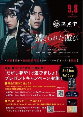 ジャニーズWESTの重岡大毅がW主演を果たす、9月8日(金)公開のホラー映画『禁じられた遊び』とのコラボレーションキャンペーン、“「だがし夢や」で遊びましょ”を開催いたします。