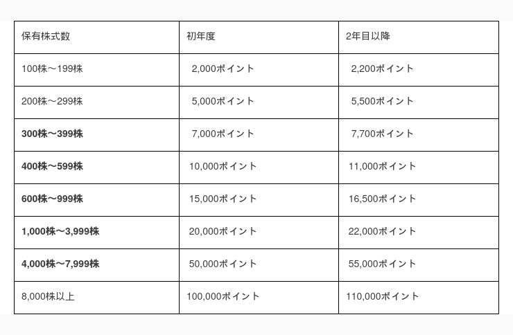 ※太字は変更後の単元株式数当たりの株主優待ポイントが拡充になる単元株式数が含まれる保有株式数です。