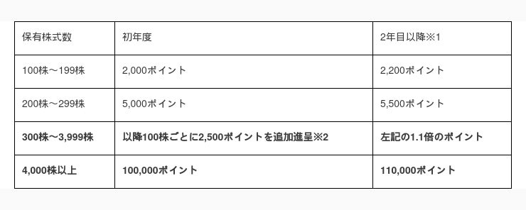 ※2.例として保有株式数が300株の場合は7,500ポイント(現行制度:7,000ポイント)、1,000株の場合は25,000ポイント(現行制度:20,000ポイント)が進呈されます。
