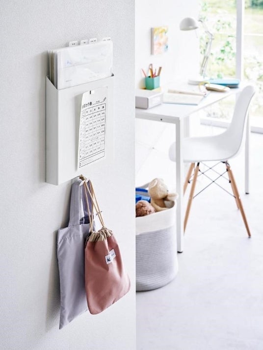 プリント類や手さげ袋などを壁に浮かせて一括収納。