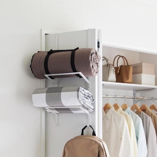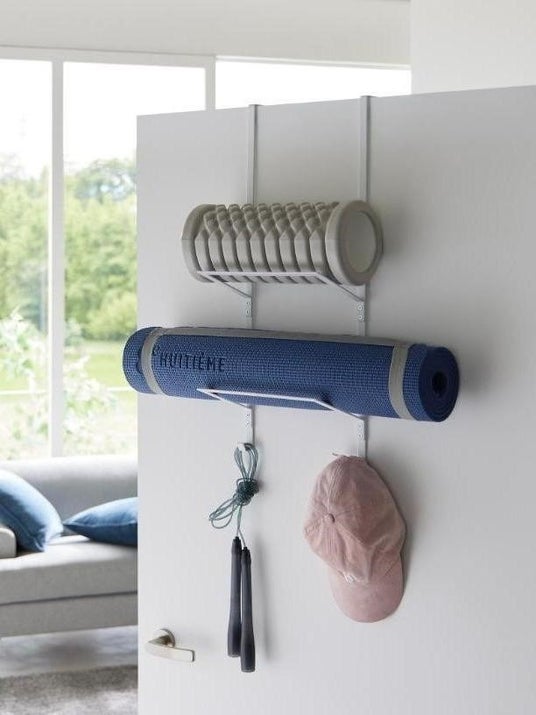 ドアやクローゼットの折れ戸にフィットネスグッズをまとめて収納!