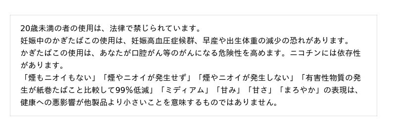 [5]紙巻たばこ喫煙からの完全な移行を前提とした、科学的根拠の重み付けに基づく。これらの製品に健康へのリスクがないことを意味するものではありません。これらの製品は依存性のあるニコチンを含みます。