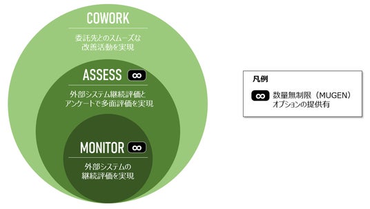 3rd PARTY MONITOR、3rd PARTY ASSESSにおいて、多数の委託先の評価・管理や、評価対象が不確定な契約前のセキュリティチェック等で利用できる「∞(MUGEN)」オプションを提供します。コストを考慮して、委託先管理ツールを活用できなかったケースでも、このオプションを利用することで、委託先評価・管理を効率的・効果的に行うことが可能です。