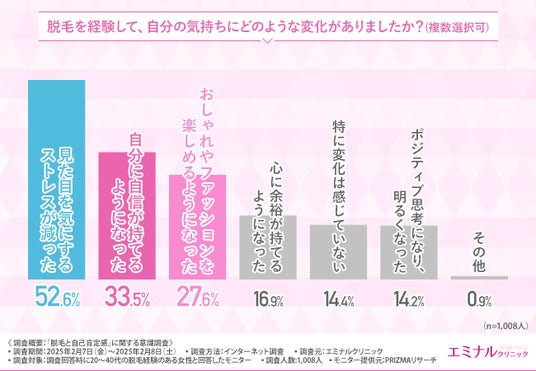 「脱毛を経験して、自分の気持ちにどのような変化がありましたか?(複数選択可)」と質問したところ、『見た目を気にするストレスが減った(52.6%)』と回答した方が最も多く、『自分に自信が持てるようになった(33.5%)』『おしゃれやファッションを楽しめるようになった(27.6%)』と続きました。