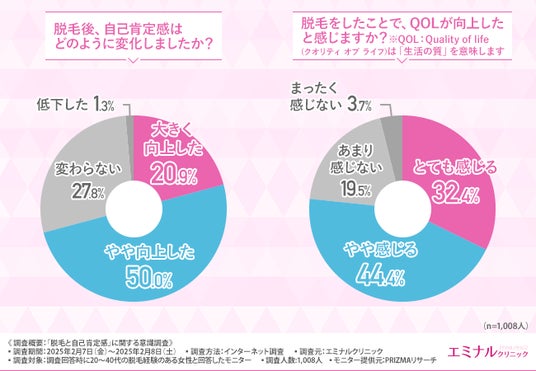 また、脱毛には、自己処理の手間が省ける、肌トラブルを防げるといった実用的なメリットがありますが、それだけではなく、自己肯定感(セルフエスティーム)やQOL(生活の質)にも影響を与えるのではないかという関心が高まっています。