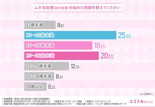 はじめに、「ムダ毛処理(自己処理)を始めた時期を教えてください」と質問したところ、『12~15歳未満(25.4%)』と回答した方が最も多く、『18~22歳未満(20.5%)』『15~18歳未満(18.8%)』と続きました。