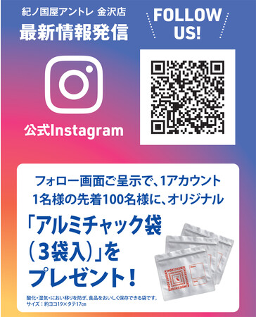 金沢店の公式Instagramをフォロー後、店頭でフォロー画面をご呈示いただいたお客さま先着100名さまに、
