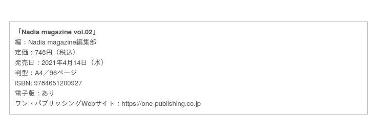 株式会社 ワン・パブリッシング(東京都台東区/代表取締役社長:廣瀬有二)は、2021年4月14日(水)に「Nadia magazine vol.02」(定価:748円(税込))を発売します。