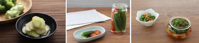 メニュー名(左から):「ブロッコリーの芯でつくる もったい菜漬け」、「まるごとオクラとミニトマトのピクルス」、「伏見とうがらしの万能南蛮だれ(和風)」