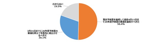 暫定予算案を編成することで、最長4月11日まで26年度予算案を審議する時間が確保される。これにより国会での議論が「充実するとは思わない」が43.7%で、「充実すると思う」の33.9%を上回った。「わからない」は22.4%。
