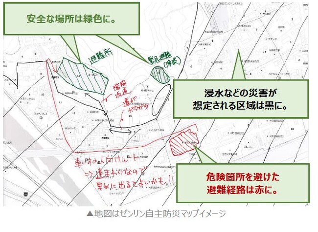 私は、自宅周辺の状況を把握するために当社が提供しているオリジナル地図作成が可能な「ゼンリン自主防災マップ」を活用しながら、自宅周辺を実際に家族とまち歩きをして、避難所までの道のりに危険箇所がないかを一緒に確認しました。