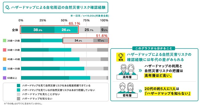 ハザードマップを見たことがある人※3は、65.1%。ハザードマップを見て自宅周辺の自然災害リスクをある程度把握できている人は、38.3%という結果に。年代が上がるにつれて割合が高くなる傾向にあるという結果がでました。一方で、20代は、ハザードマップを見たことがない人・知らない人の合計が51.6%存在し、約5人に1人(17.4%)は、「ハザードマップを知らない」という回答となり、認知度が低いことがわかりました。
