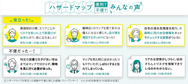 ハザードマップを見て平時の際も役に立っているという声もある一方で、ハザードマップから災害の危険度を読み取る難しさなど、ハザードマップの理解にも課題があることがわかりました。